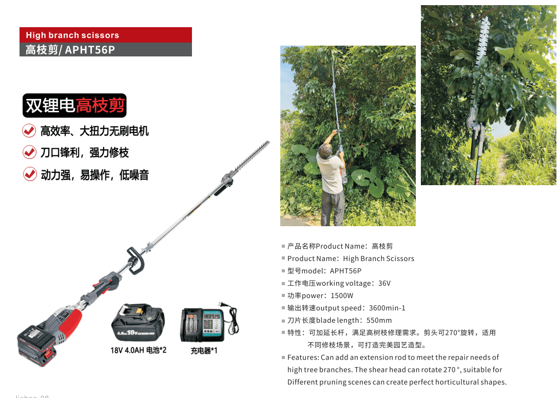 产品名称ProductName: 高枝剪 型号: APHT56P 工作电压:36V 功率:1500W 输出转速:3600min-1 刀片长度:550mm 特性:可加延长杆,满足高树枝修理需求。剪头可270°旋转,适用 不同修枝场景,可打造完美园艺造型。