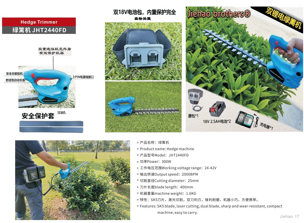 产品名称:绿篱机 产品型号:JHT2440FD 功率:300W 工作电压范围: 24-42V 输出转速: 2000BPM 切割直径: 25mm 刀片长度:400mm 机器重量: 1.6KG 特性:SK5刀片,激光切割,双刀利刃,锋利耐磨,机器小巧,方便携带。