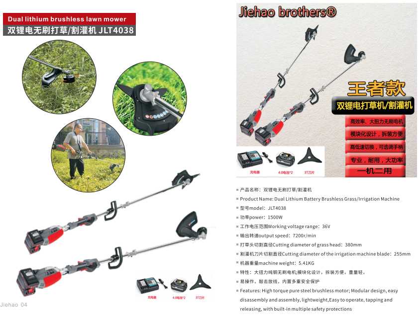 产品名称:双程电无刷打草/割灌机 型号: JLT4038 功率:1500W 工作电压范围: 36V 输出转速:7200r/min 打草头切制直径: 380mm 割灌机刀片切割直径: 255mm 机器重量: 5.41KG 特性:大扭力纯钢无刷电机;模块化设计,拆装方便,重量轻, 易操作,敲击放线,内置多重安全保护